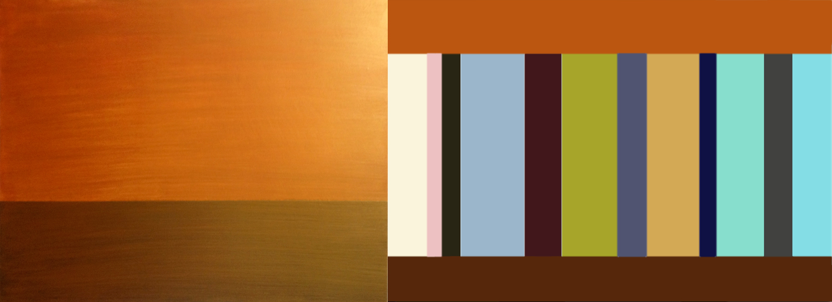 I am working out the palette for “Sunset”. The orange gold glowing base will compliment the colors that will come over the top. The sun is setting , light fades and everything becomes less defined. The bright colors are a reminder of the day we just experienced and the darks lean towards the coming night.
