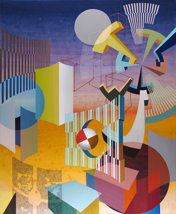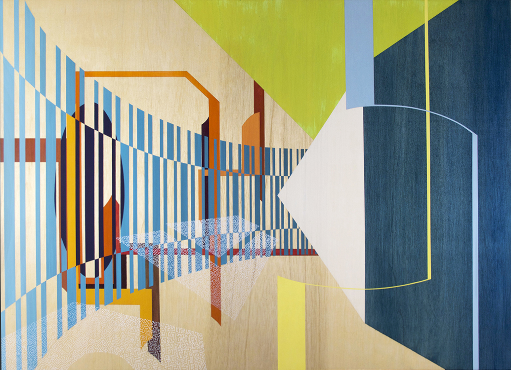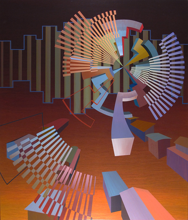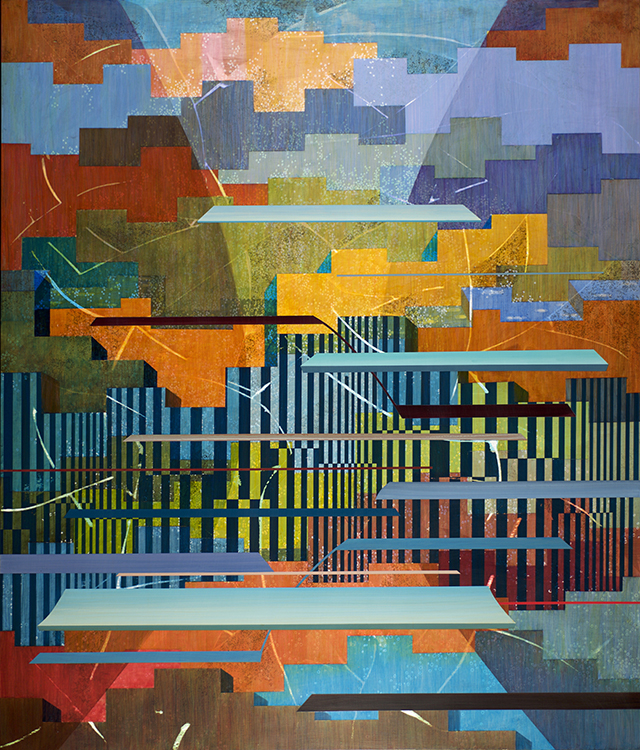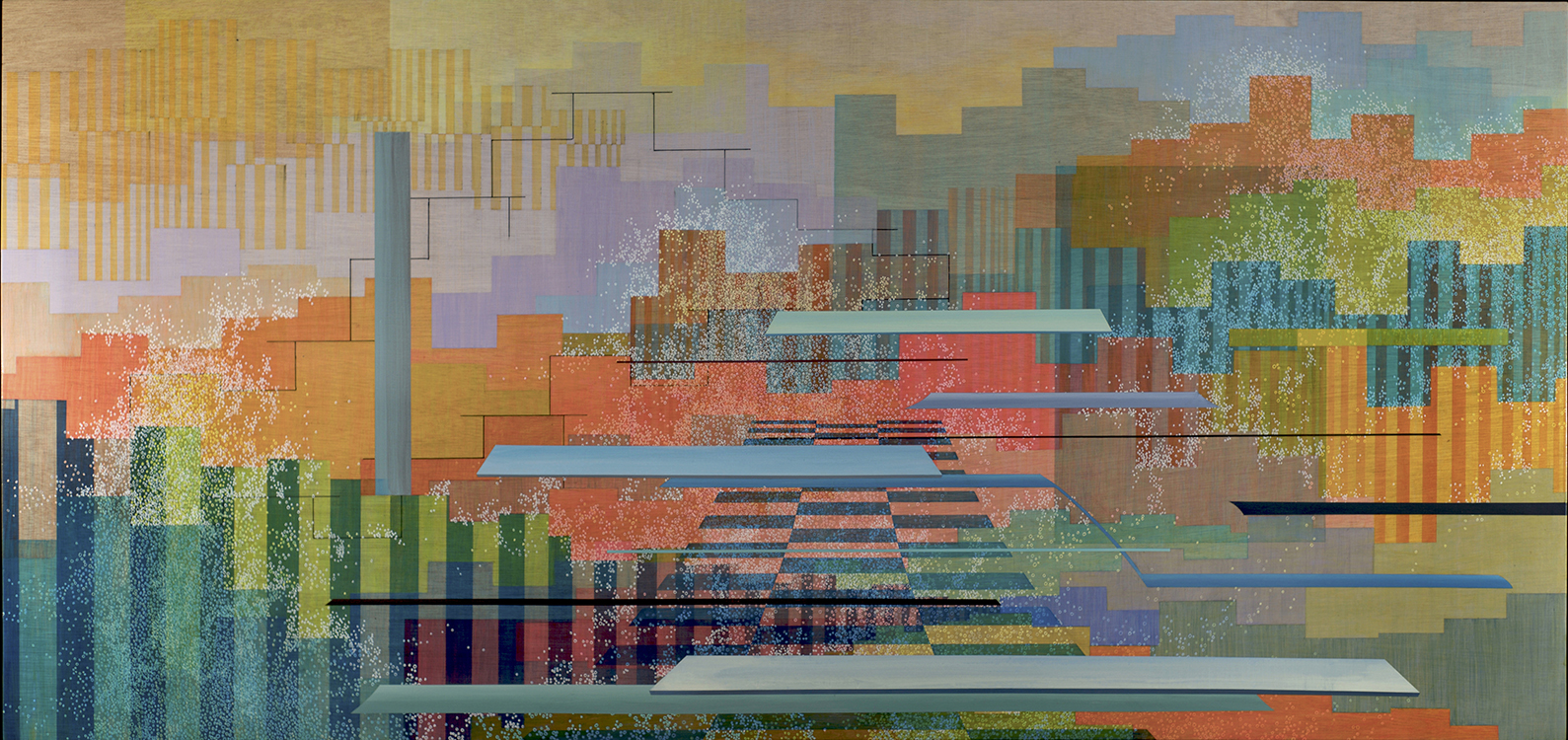 When you turn your gaze down and look from the horizontal perspective, One can recognize outlines and buildings used to identify a location and a horizon is identified. The foreground composition consists of colors and forms inspired by short glances, impressions, and photographs of areas I visit while traveling in the Southern California area. I try to contrast the idea of a fleeting unbalanced glance with the balance achieved in stasis. The rectangular paintings in my series demonstrate this concept.
