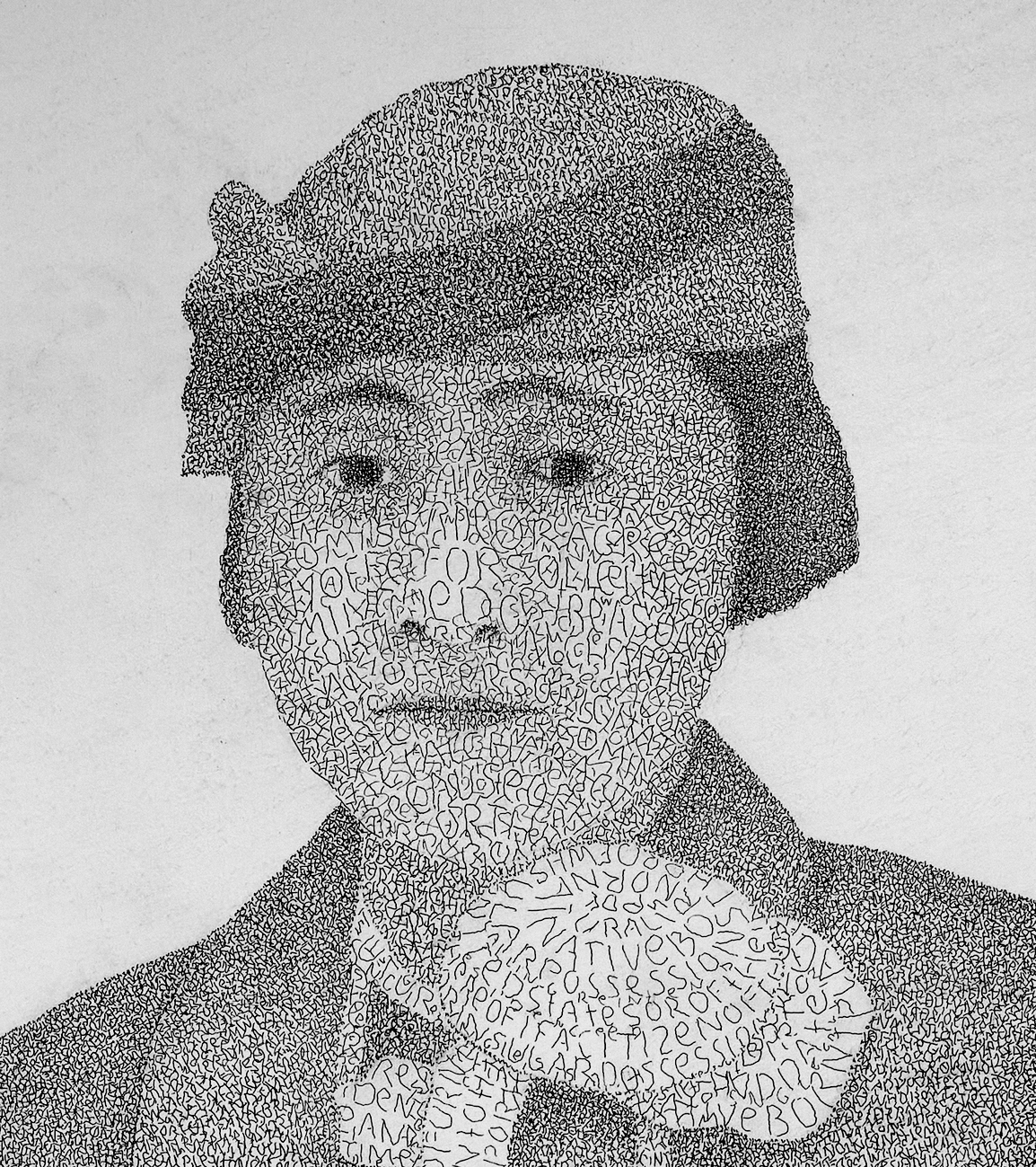 The words used to make the marks that compose this portrait are the text from Executive Order 9066, which was an Executive Order signed by FDR that established military areas excluding those of Japanese descent and establishing the internment camps away from the West Coast.