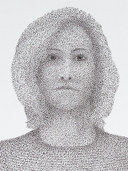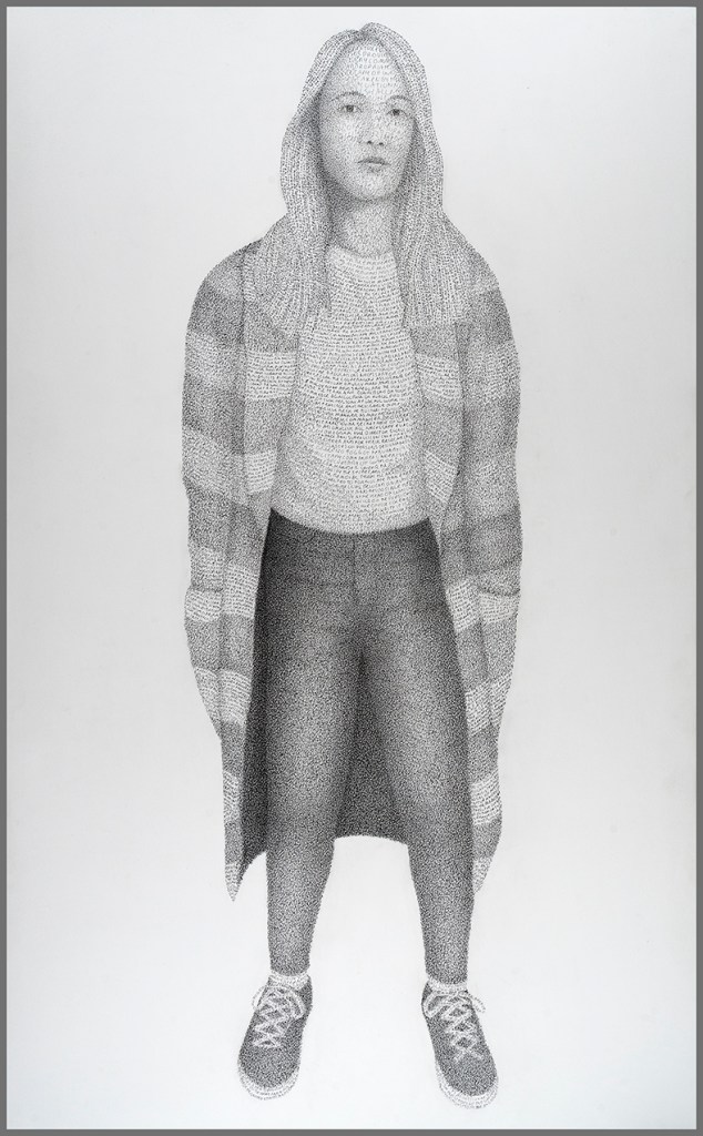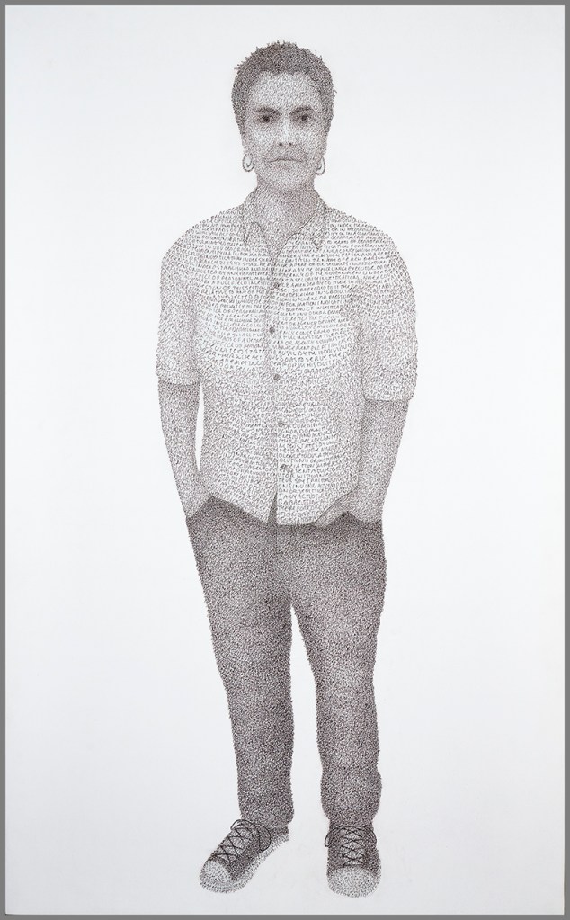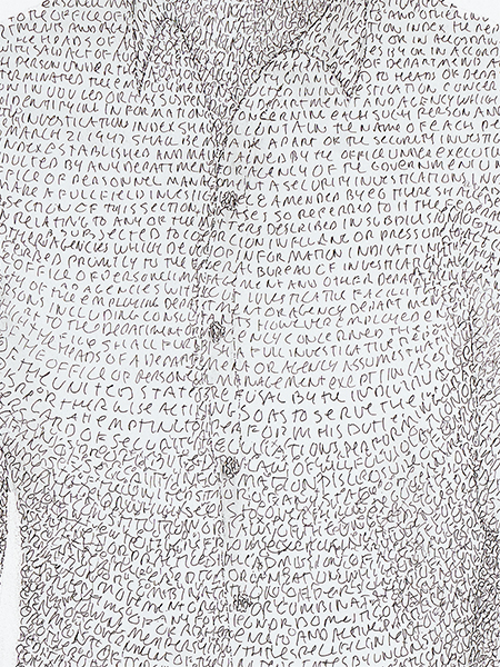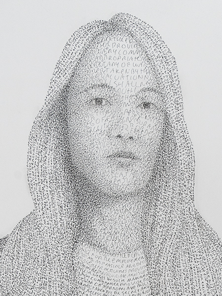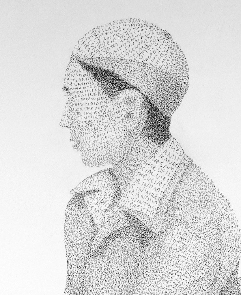 I will be showing 2 pieces from my new ink on panel portrait series that examine the current social and political environment and put contemporary elements in context with historical events. I use the text from government documents or declarations from the past and use those words as my mark to make portraits of people standing strong in the face of government oppression.