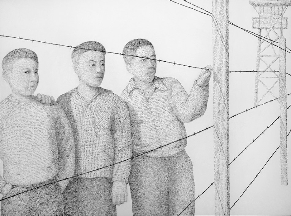 Using one of Toyo Miyatake’s iconic photographs from Manzanar as a reference I utilize words as my mark to reinterpret his image to show strength in the face of oppression. The words are Executive Order 9066 which authorized the imprisonment of West coast Japanese Americans and Executive Order 9102 which established the War Relocation Authority who oversaw the internment.