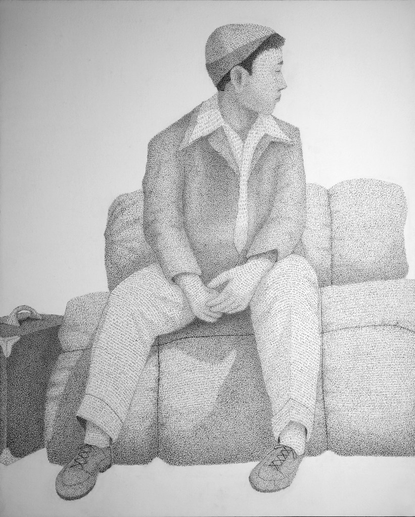 This is a portrait is of my grandfather depicted as he was waiting to board a bus to the Internment camps for Japanese Americans during World War II. The photograph I referenced for the portrait was taken by Dorothea Lange as she and Ansel Adams were commissioned to document the internment of Japanese Americans. This portrait and how it relates to what is happening now was the starting point for this series. There is a common connection that is at once deeply personal and at the same time universal that I hope will inspire dialog and further research on the viewers behalf.