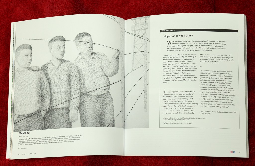 I am honored to have my work featured in “Centerpoint Now” a book that marks the 75th anniversary of the United Nations. The book features artists, activists, scientists and others who through their work help to access the complex issues that oppose the United Nations global endeavor for peace. The article is a statement on the criminalization of immigration. The publication will be distributed to the office of each of the 193 member states of the United Nations.