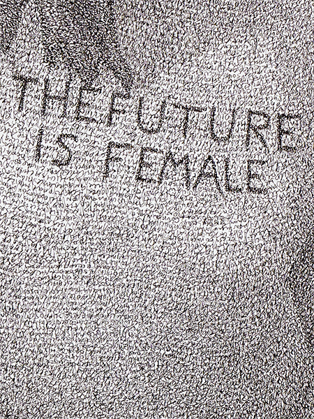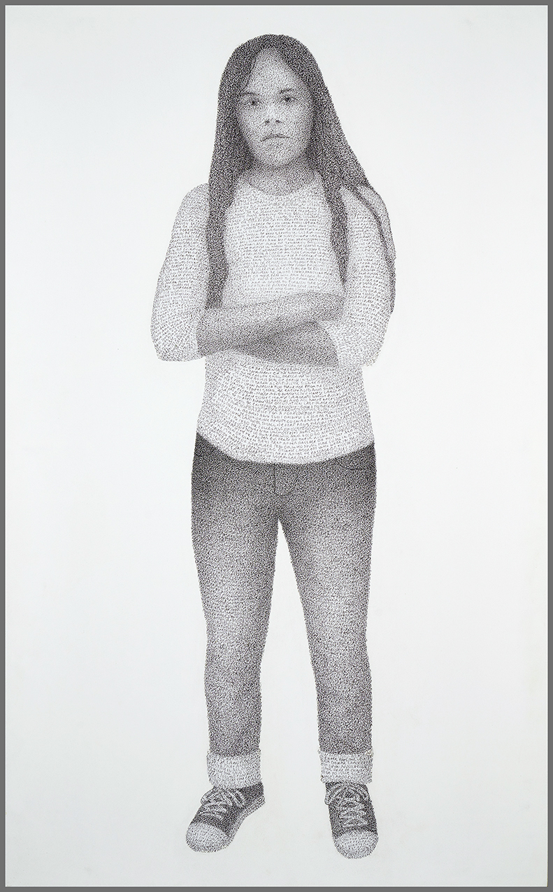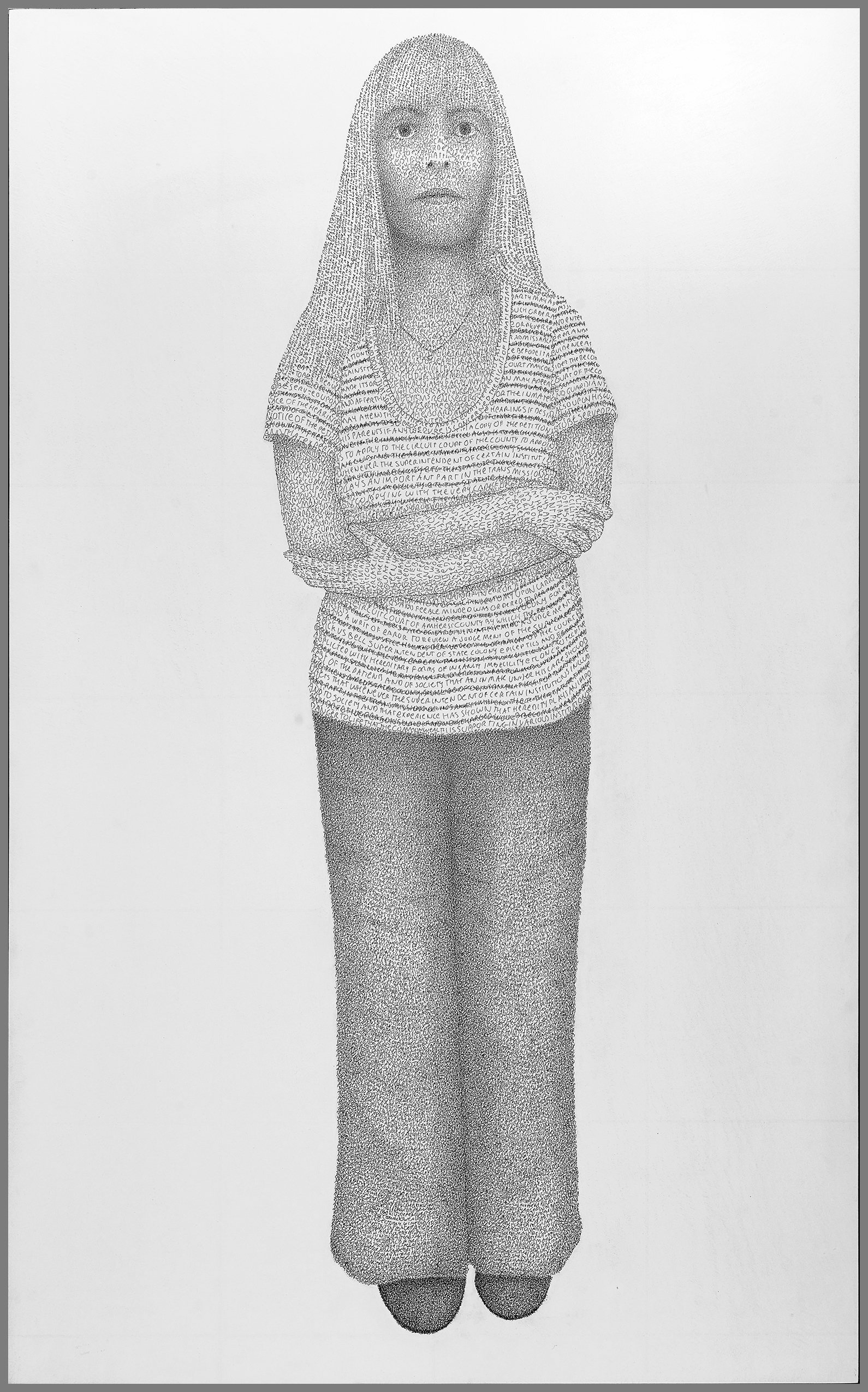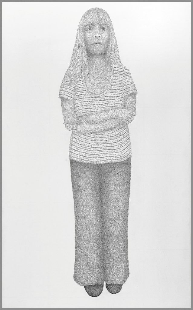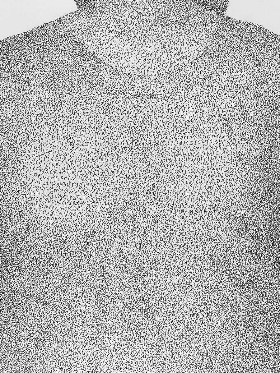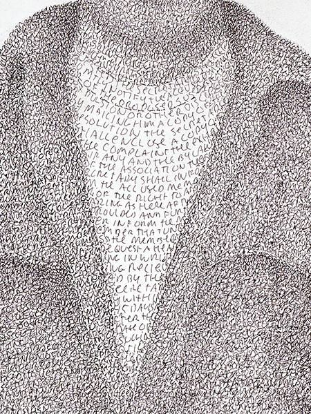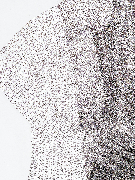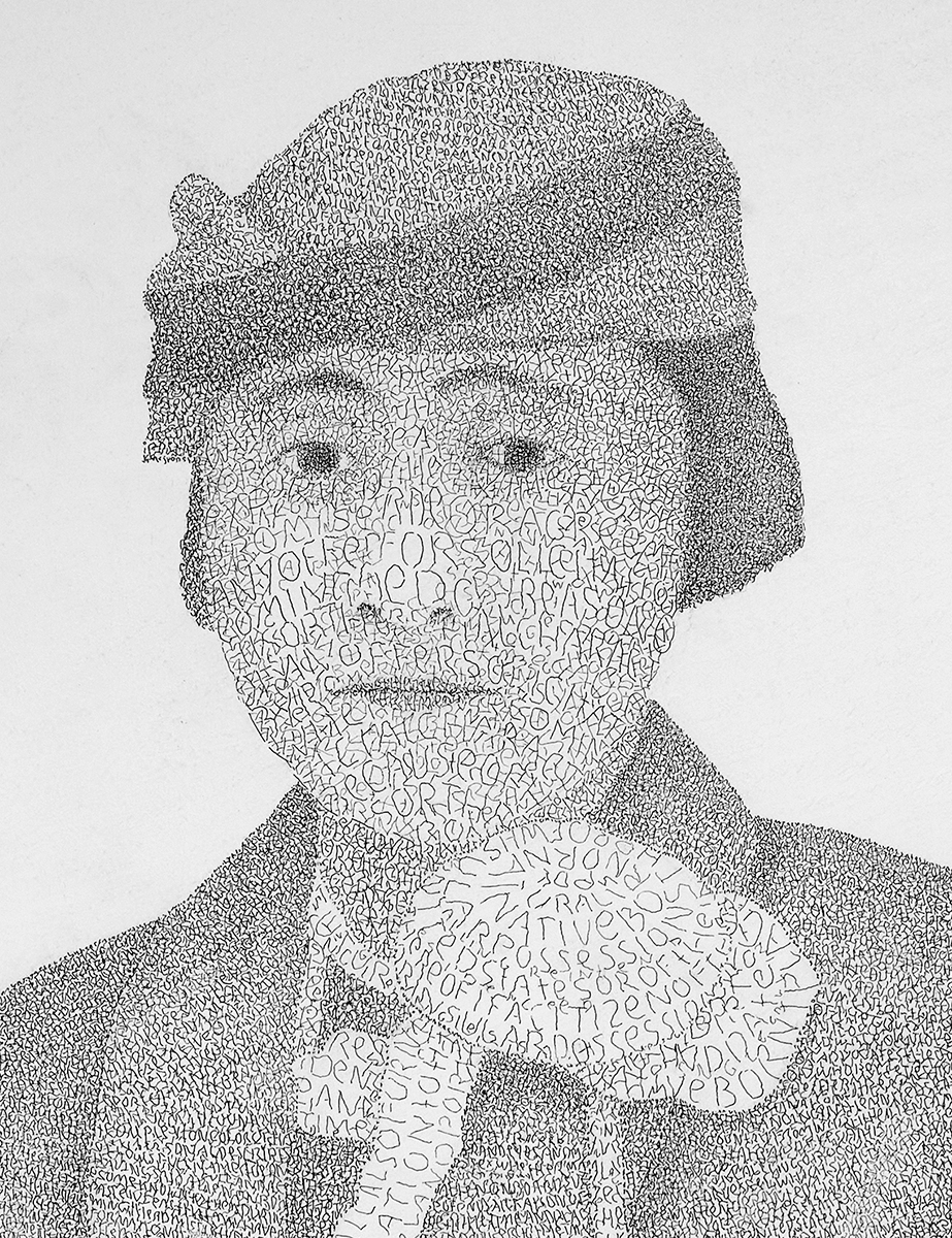 The marks that form the drawing are the words of the Declaration of Sentiments from 1848, which was a declaration based on the Declaration of Independence, that renounced the government at that time because it did not recognize women as equal. The Declaration of Sentiments is one of the first documents to claim equal rights for women and it marked the beginning of the women’s rights movement.