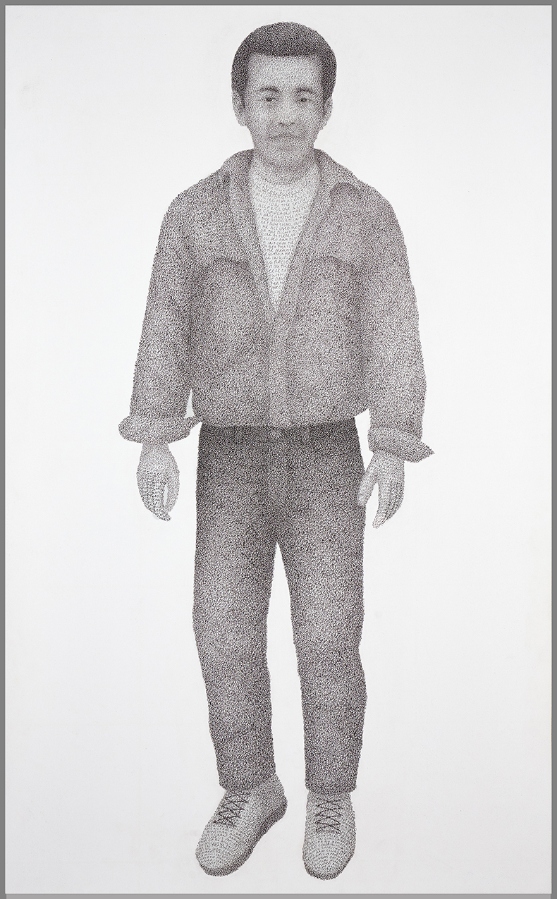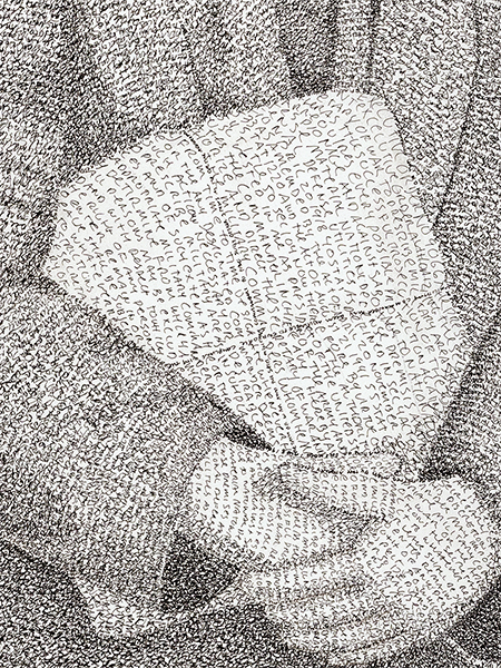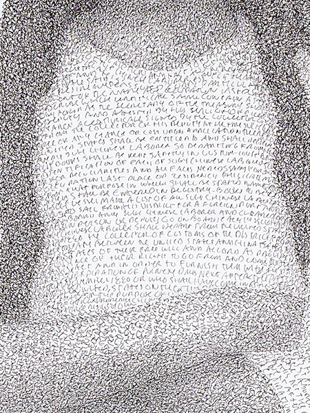 The text used to render the portrait is The Chinese Exclusion Act of 1882, which was the first and only law to prevent all members of a specific ethnic group from immigrating to the United States. Many Americans on the West Coast attributed declining wages and economic ills to Chinese workers so Congress passed the Exclusion Act to placate worker demands and assuage prevalent concerns about maintaining white “Racial Purity”