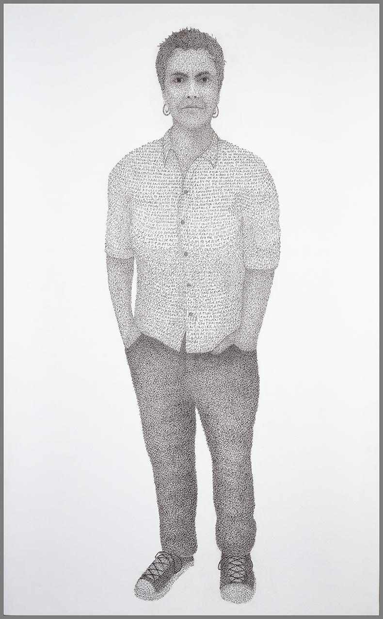 I research and reference texts from government documents and use the words as my mark to render each person with the very words that affect them. Using the word as a building block does not label or define the subject by the words being used, instead the words are blended together and they are transformed from a label to a broader gesture that is used to define a new visual standard of vitality and beauty.