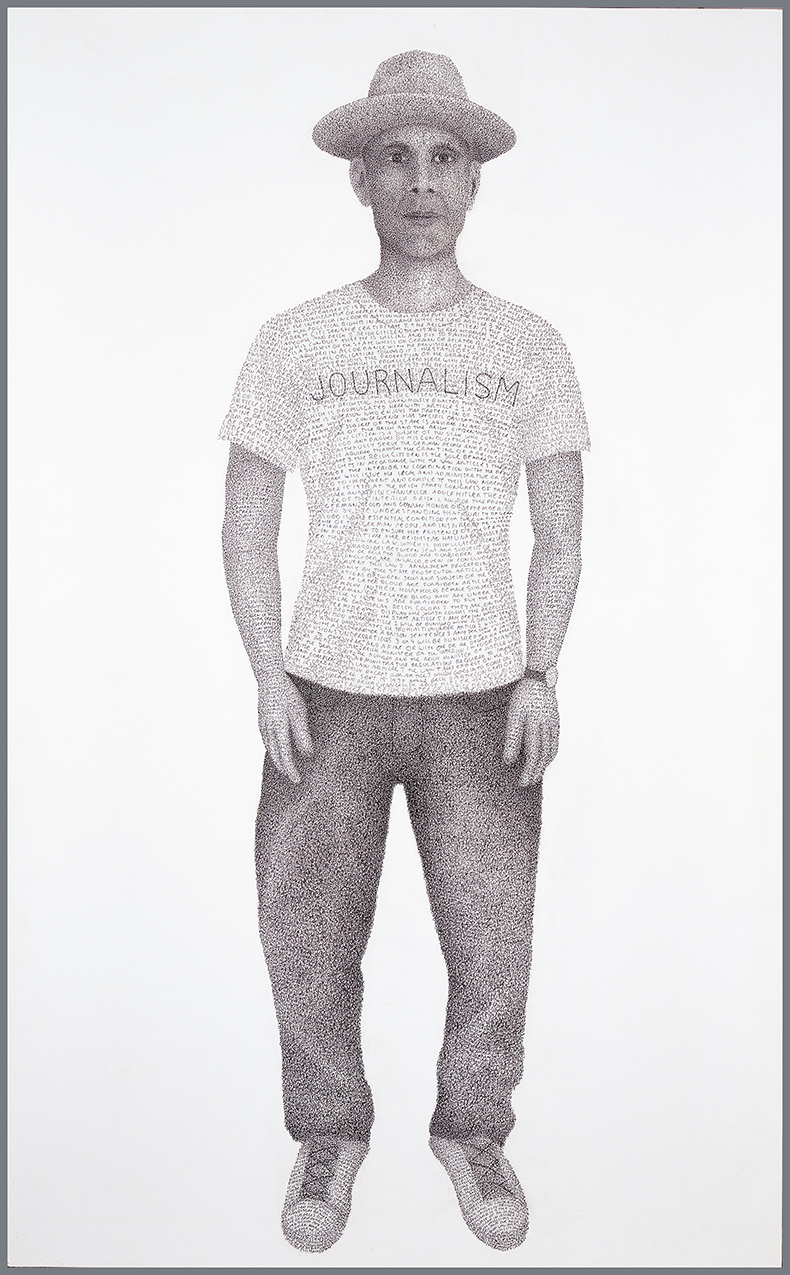 I chose to use the text from the Bill of Rights as my mark as it reaffirms the ideas of individual rights and equality that are the values upon which our nation was built. But, by portraying him seated, filling half the frame allows him to represent the inequity that is the reality of our unfulfilled potential