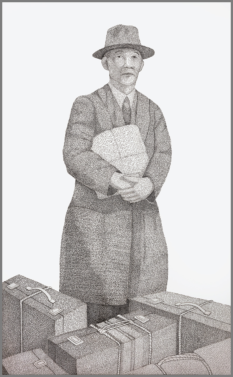 This is a portrait of my grandfather drawn from a photograph taken by Dorothea Lange when she was commissioned to photograph Japanese Americans being interned during the start of the US entry into World War II. This shot was taken in San Francisco as my grandfather and his family was waiting to board a bus for an internment camp in Utah. My grandfather and grandmother were immigrants from Japan, but my father and his brothers were born and raised in San Francisco.
