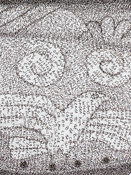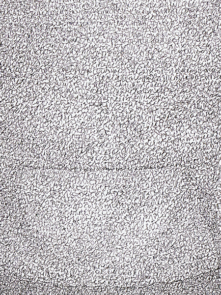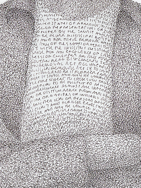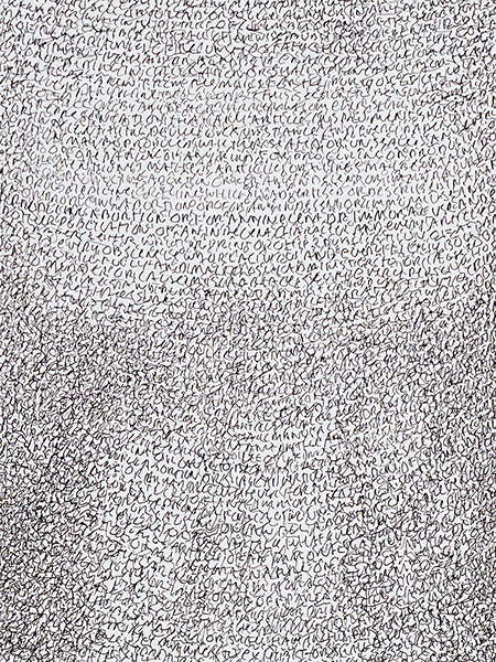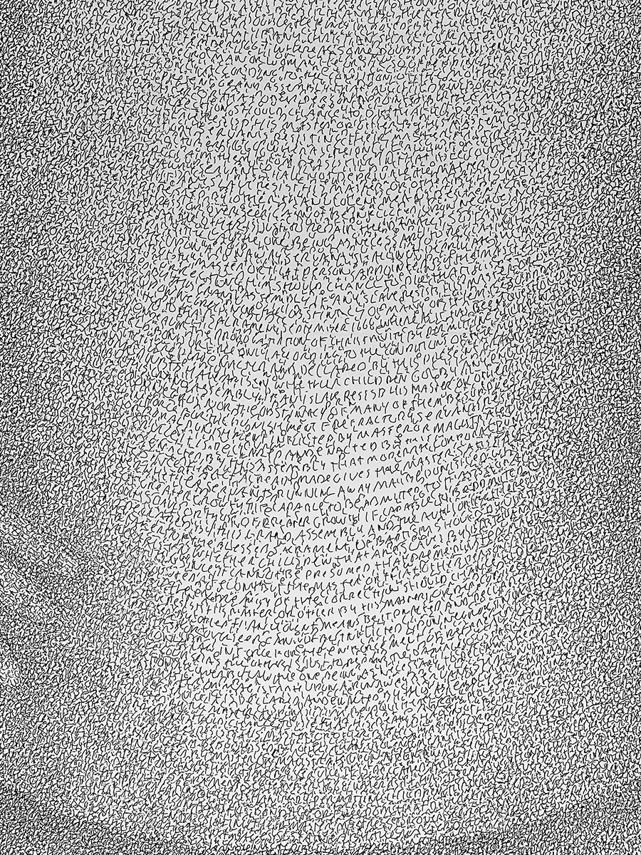 The marks are made from me writing out all of Trump’s tweets from inauguration day January 20th, 2017 to September 25th, 2017, 1550 entries. I had intended to do a year of tweets but I stopped on September 25th because I felt the piece was done and it did not need any additional weight or shading.
