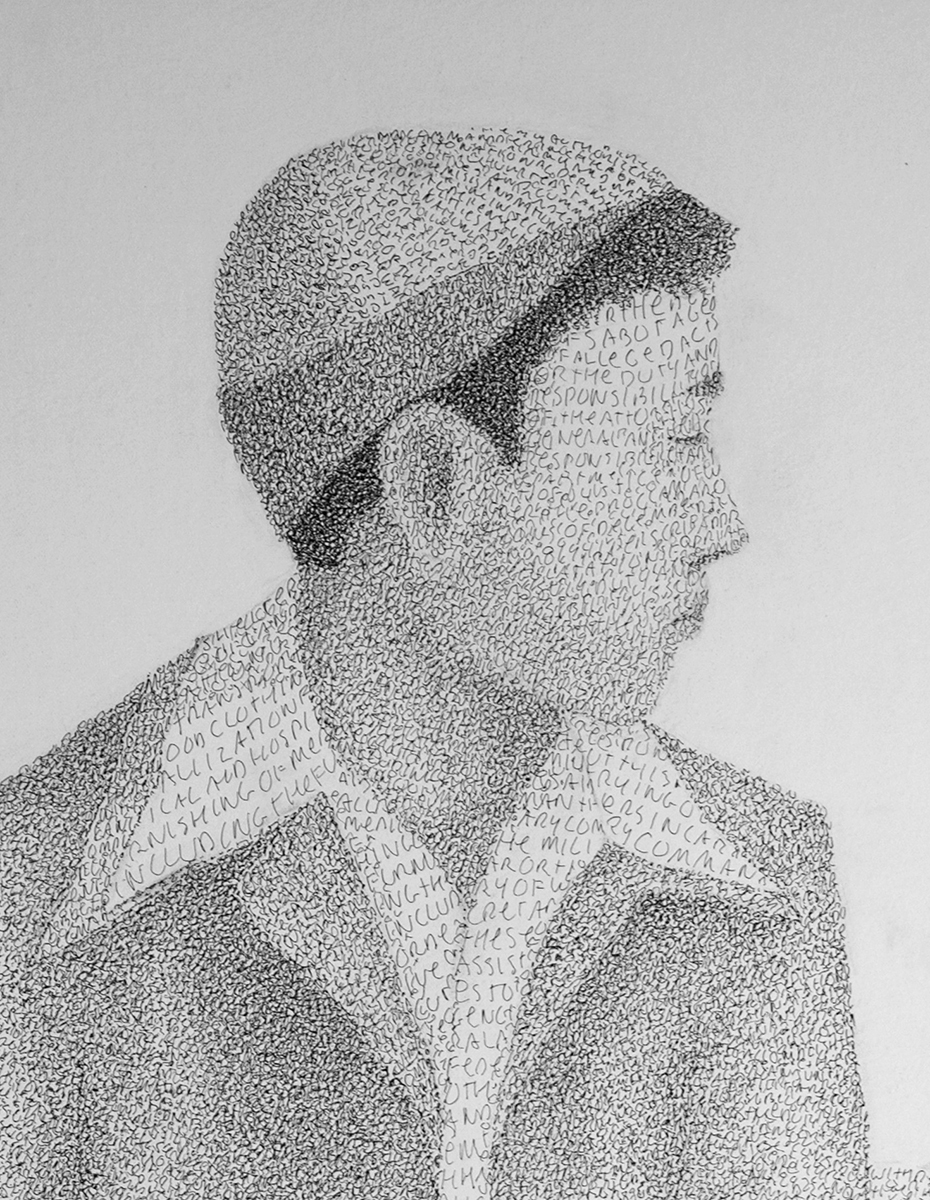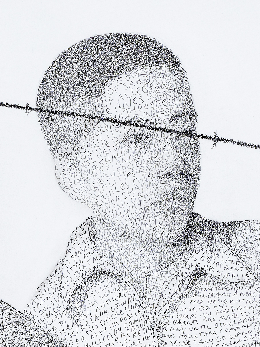 The words used to make the marks that compose this portrait are the text from Executive Order no 9066, which was an Executive Order signed by FDR that established military areas excluding those of Japanese descent and establishing the internment camps away from the West Coast.