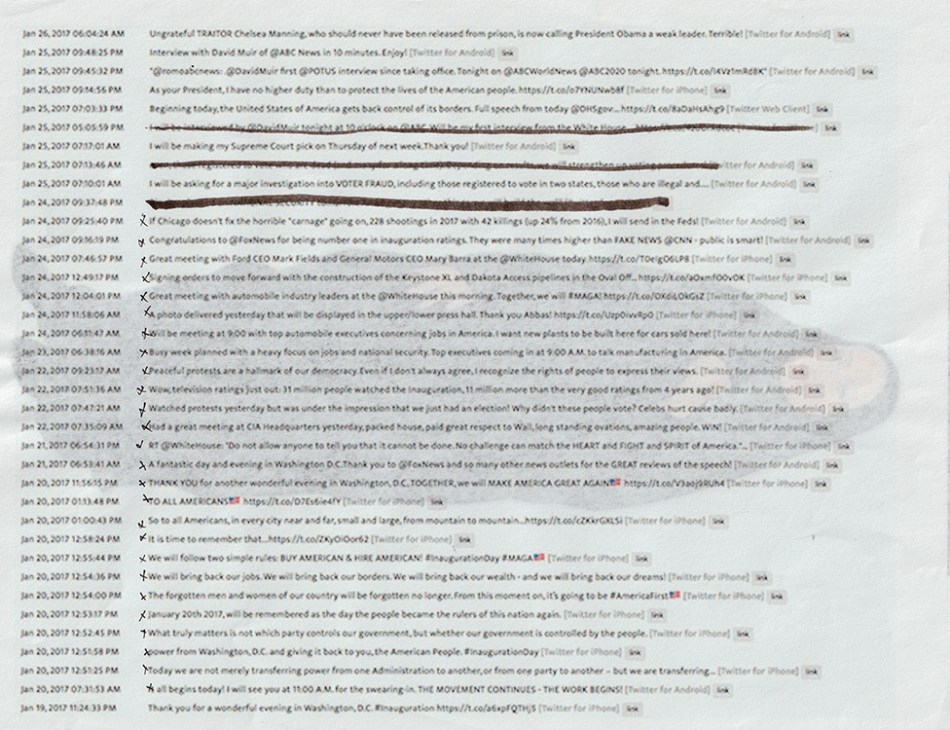 Page 1 and 2 of 72 pages of the printed reference documents of Trump’s 1550 Tweets that I used to render the portrait: