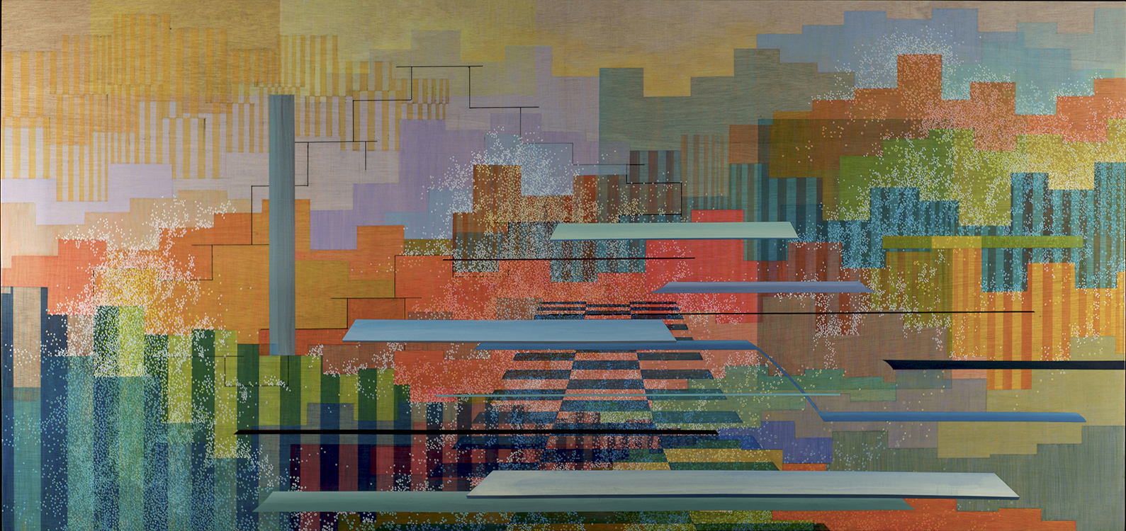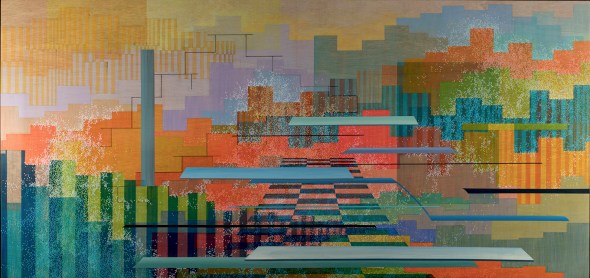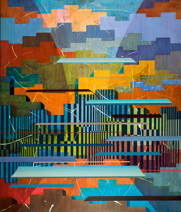 “Veil of the City” 40″ x 34″ acrylic, enamel, poly on panel 2017
